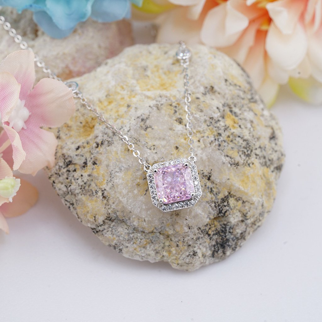 Gracefully modern, the Amoura Necklace showcases a soft pink square-cut CZ centerpiece framed by a halo of white CZ on a sleek silver chain — the perfect blend of romance and sophistication.