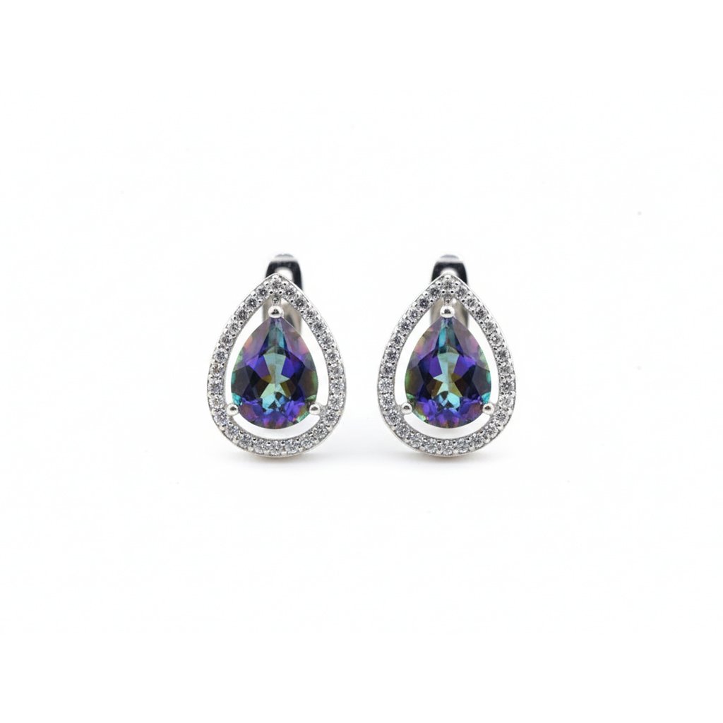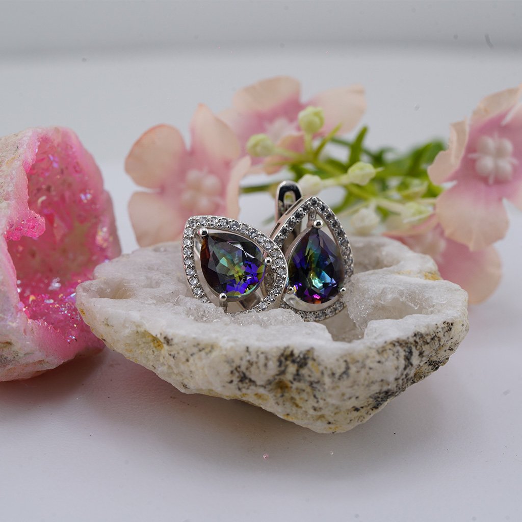 Aurora Mystique Earrings feature pear-shaped mystic quartz gemstones surrounded by shimmering cubic zirconia — capturing the mesmerizing dance of color and light in every turn.