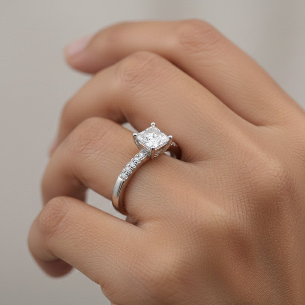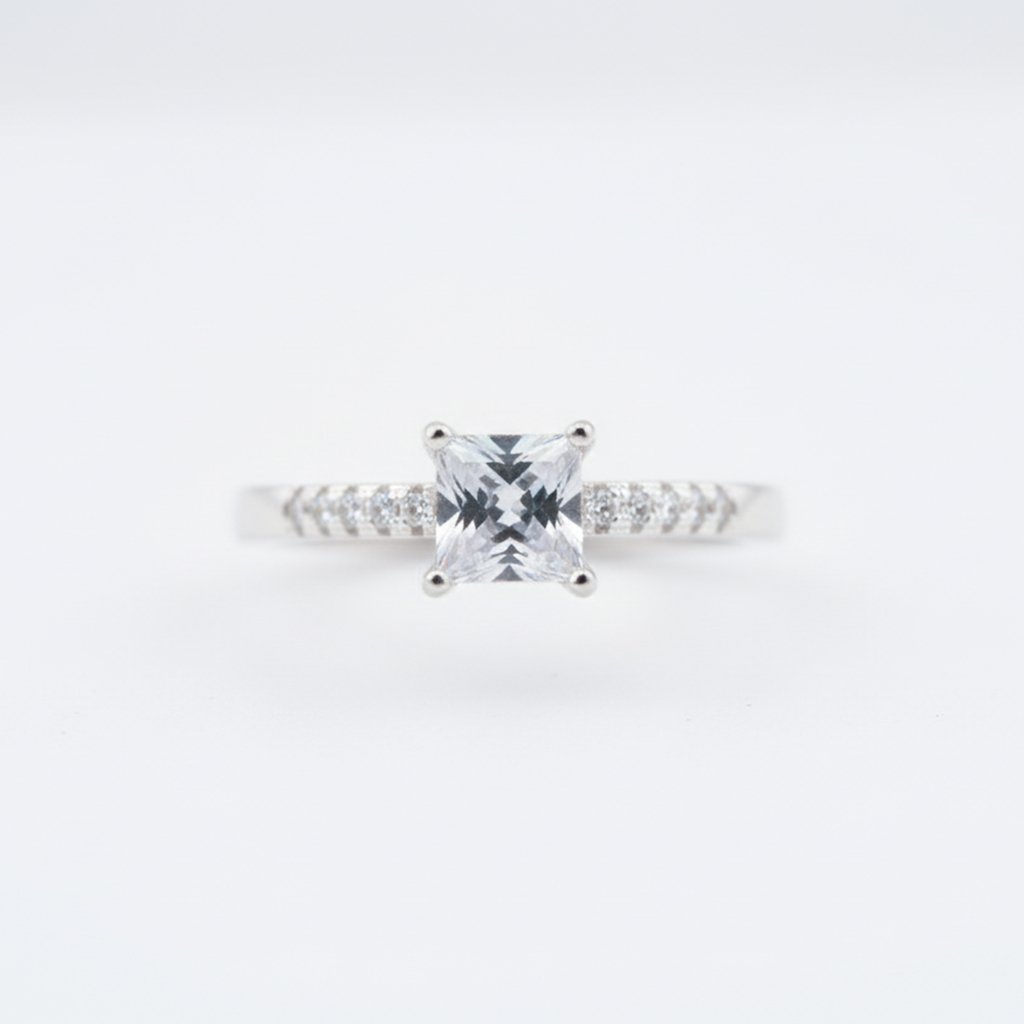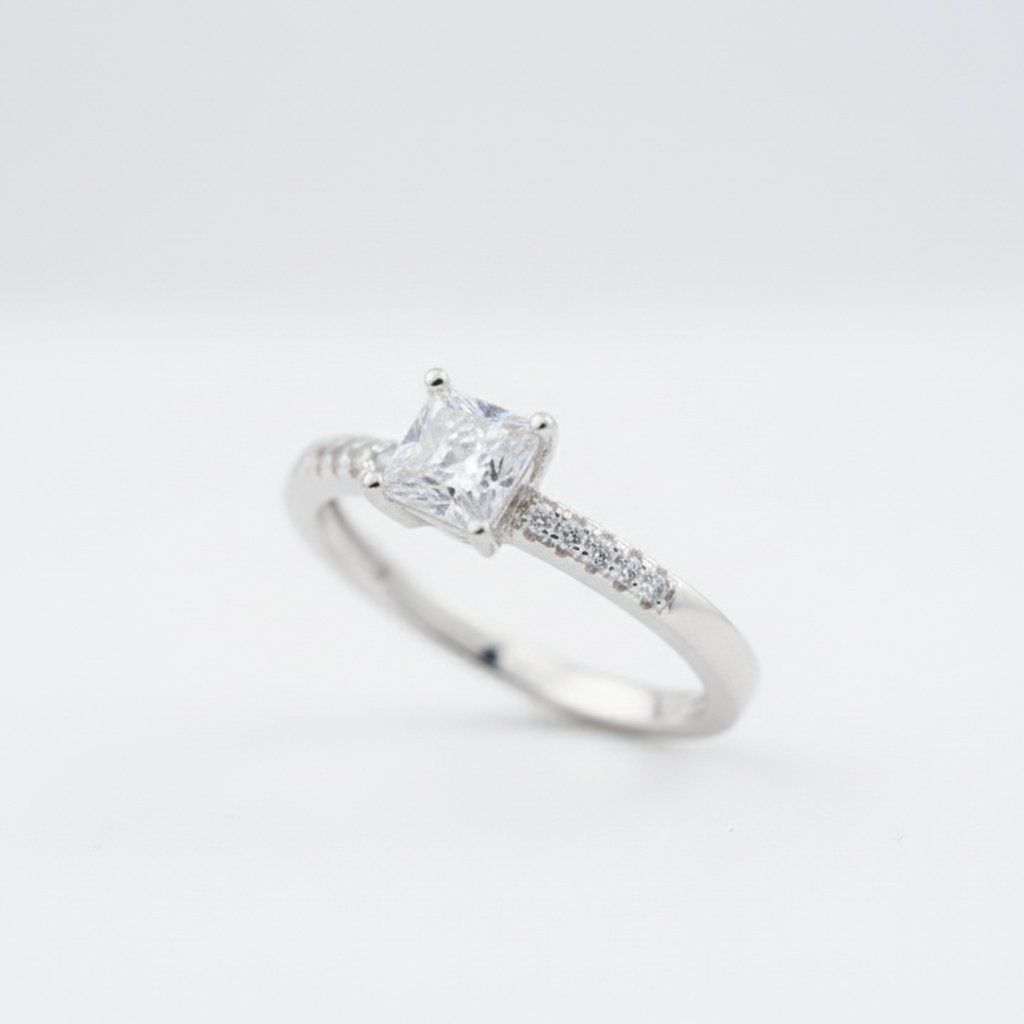 A radiant silver band featuring a brilliant princess-cut centerpiece flanked by a glittering channel of cubic zirconia (CZ) accents.