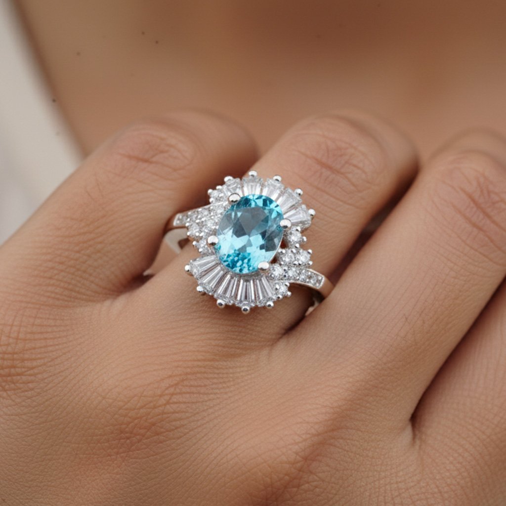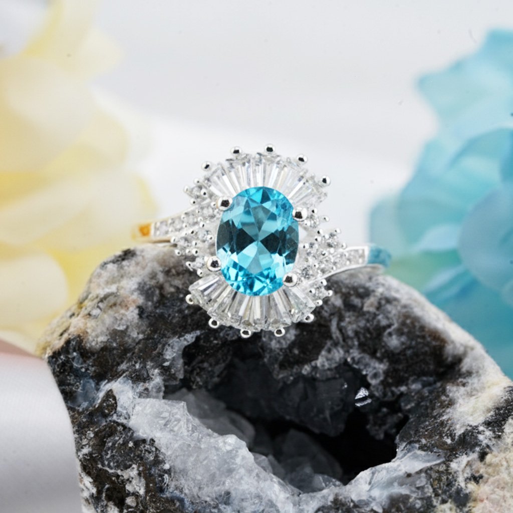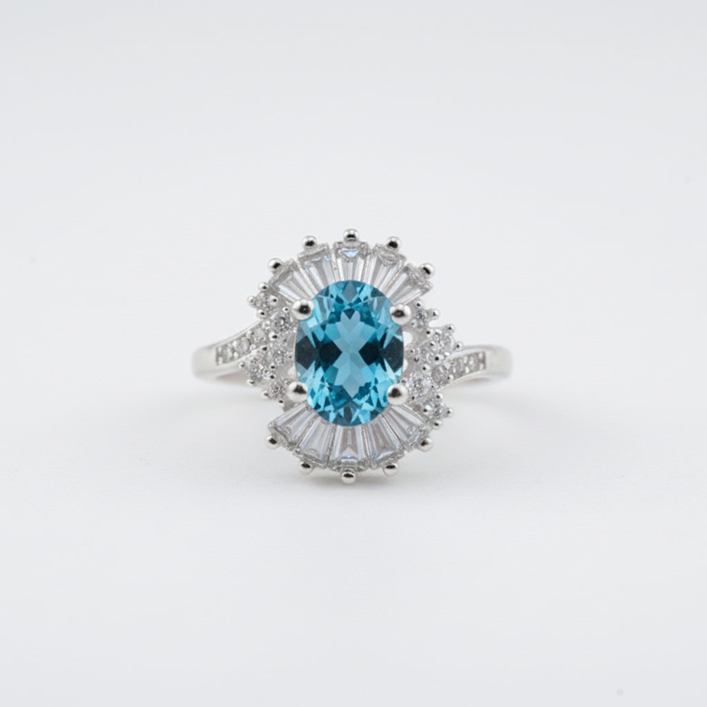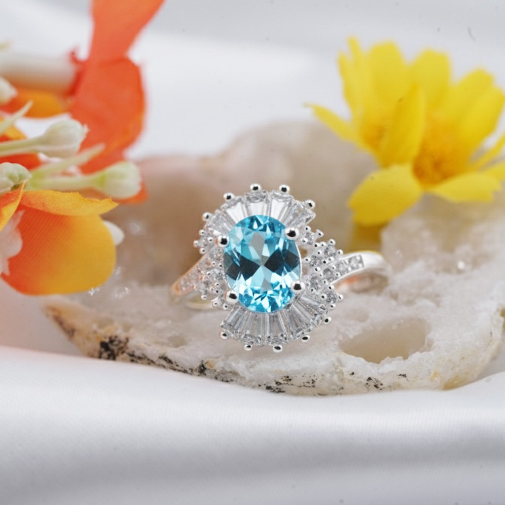A stunning Swiss Blue Topaz set in gleaming silver, encircled by a radiant halo of CZ stones that capture the brilliance of a clear summer sky.