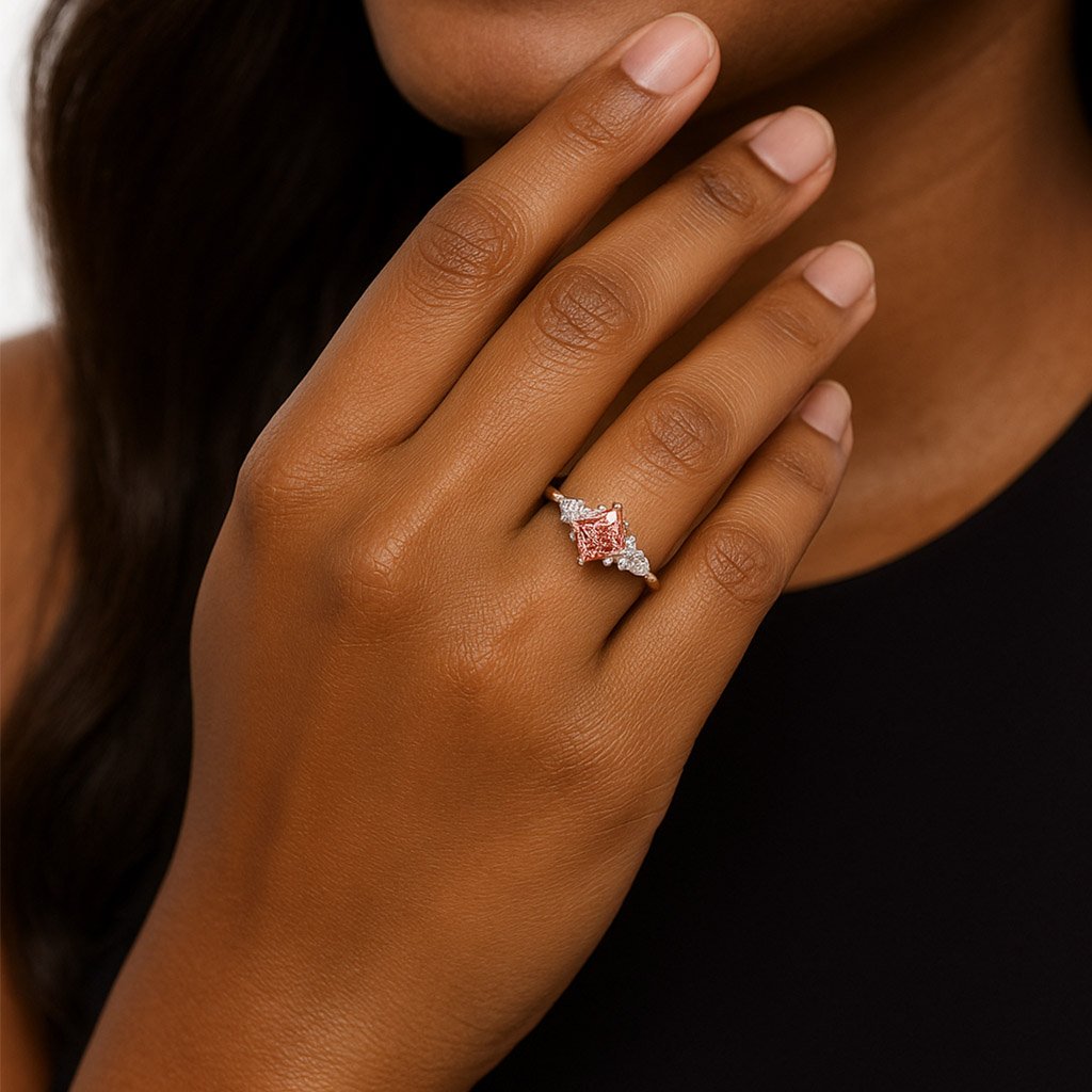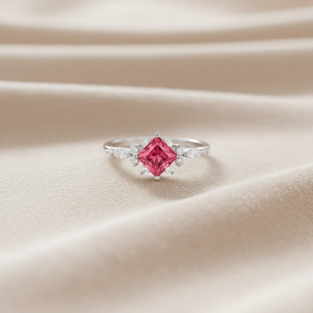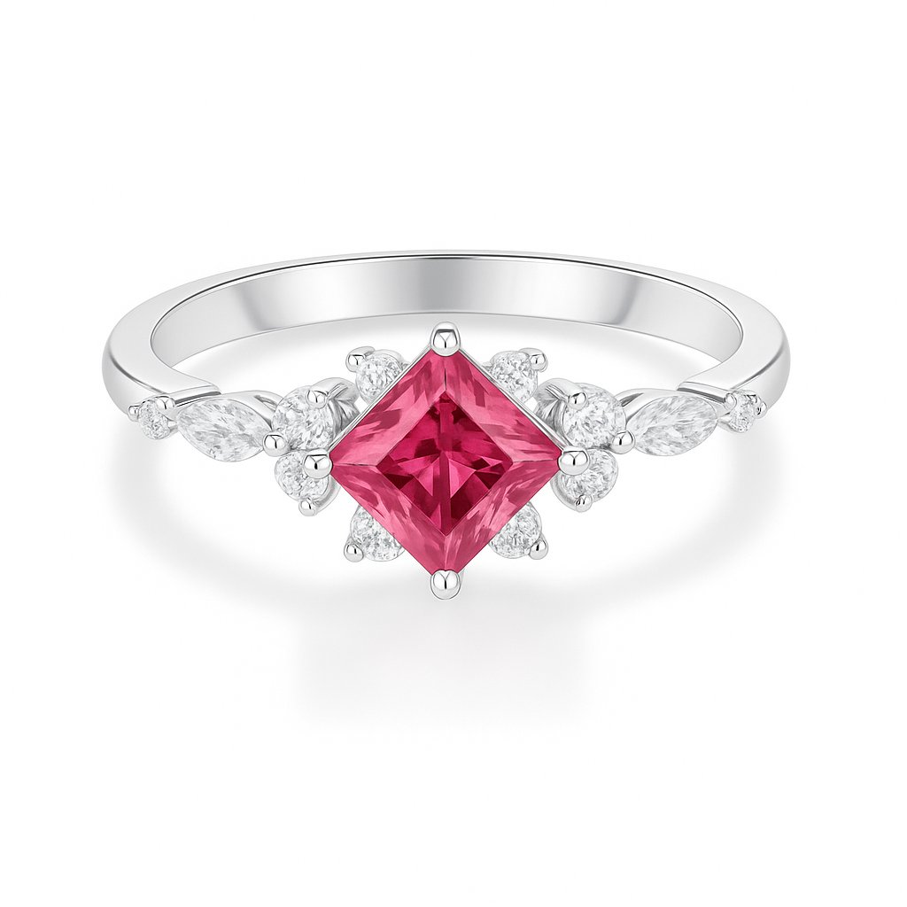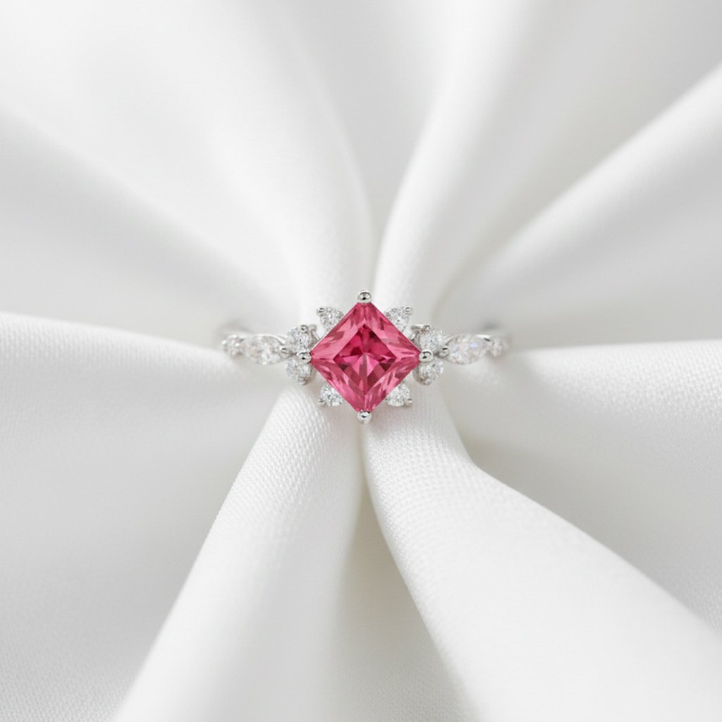 The Eternal Blush Ring captures timeless elegance with a vivid pink tourmaline at its heart, framed by sparkling diamonds on a sleek silver band that radiates feminine sophistication.