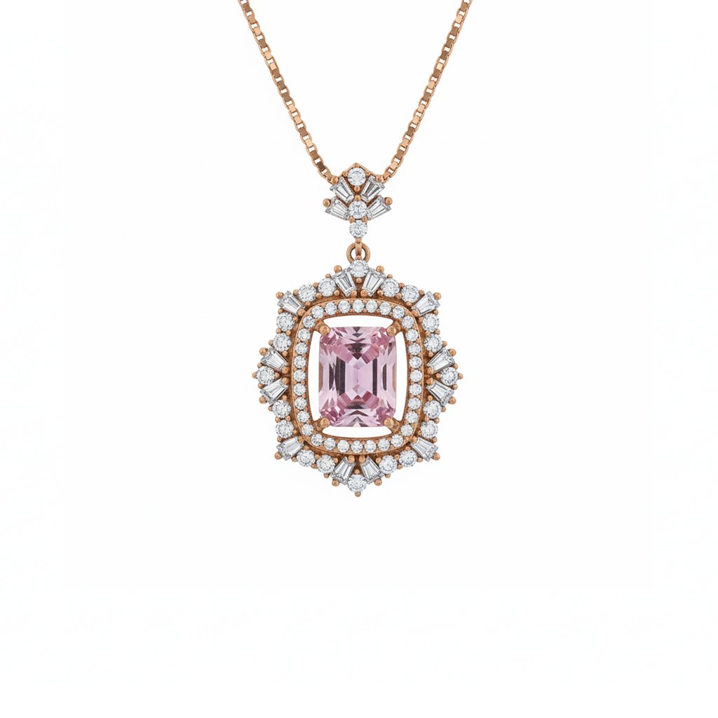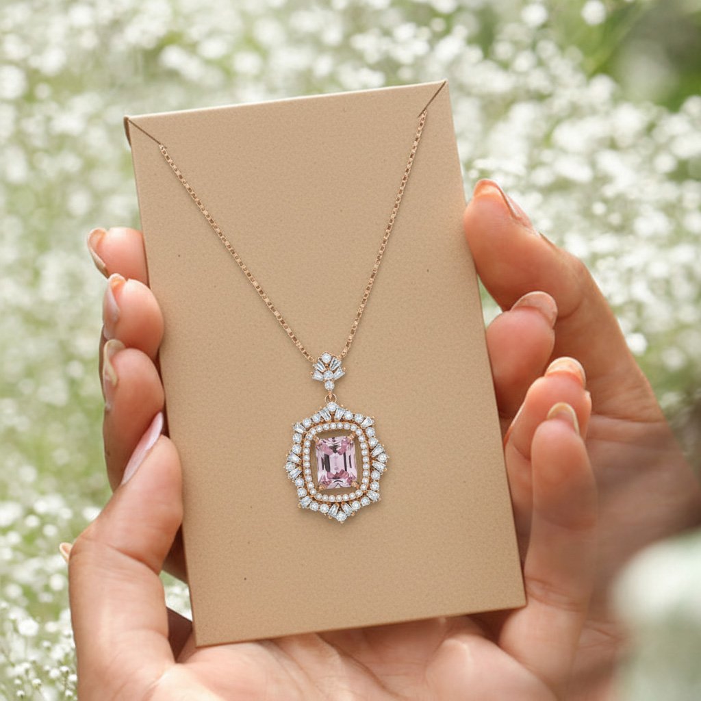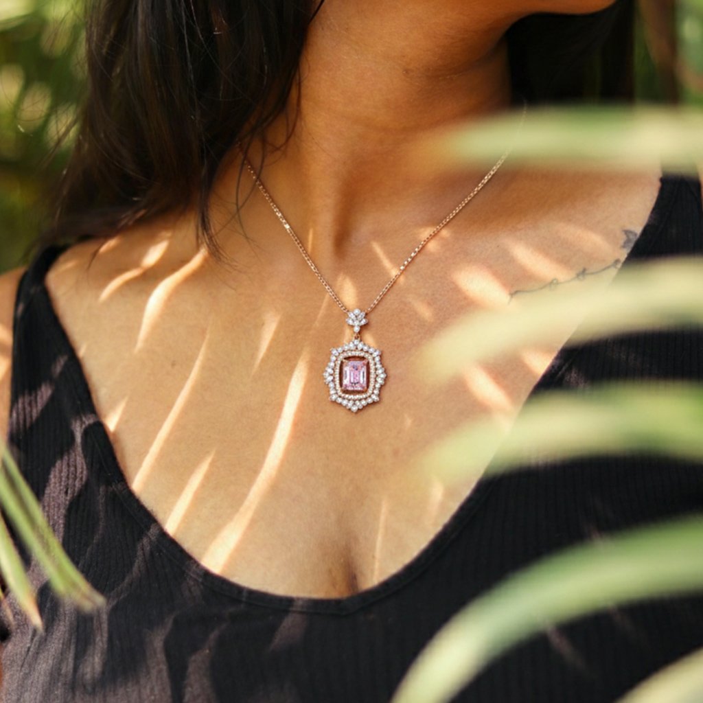 Opulent and refined, the Regalia Rosé Pendant features a blush-pink centerpiece framed by an intricate halo of baguette and round CZ stones, set in warm rose silver — an exquisite ode to timeless glamour.