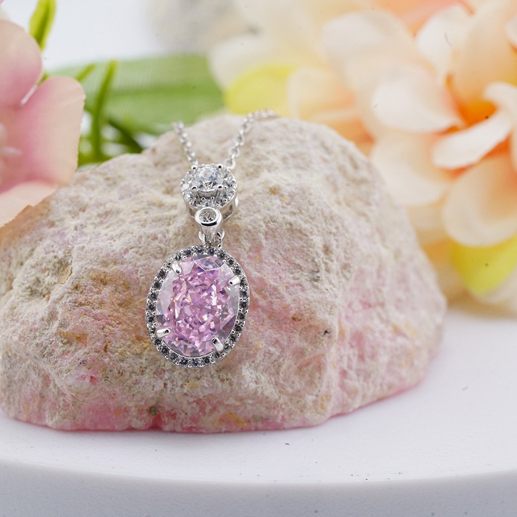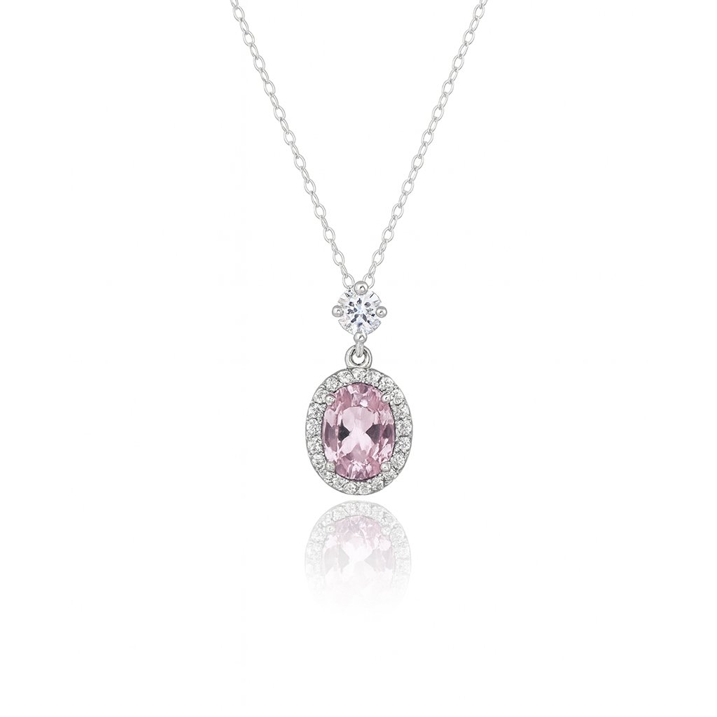 Delicate and timeless, the Blush Halo Pendant features a soft pink centerpiece surrounded by a sparkling halo of white cubic zirconia, all set in polished silver — a graceful expression of femininity and charm.