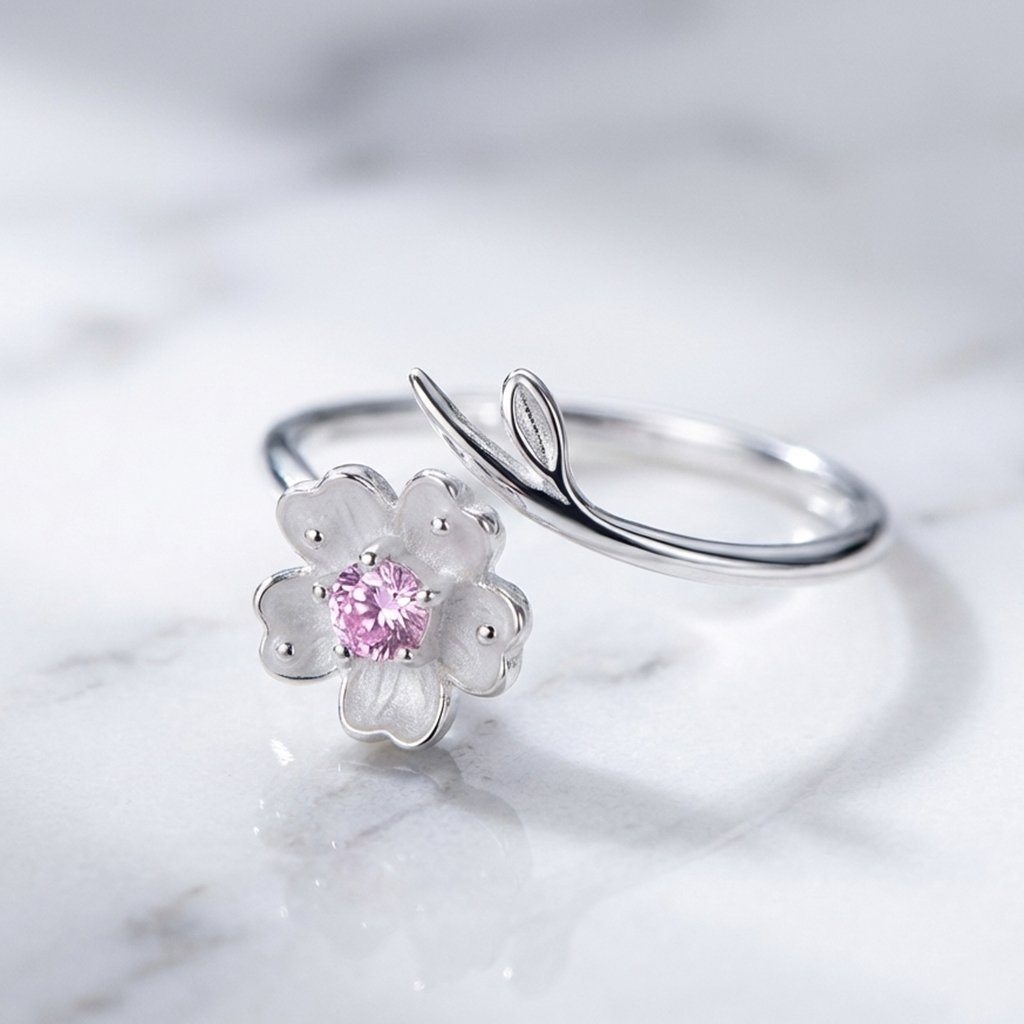 Wrap your finger in the delicate beauty of spring. Crafted from Sterling Silver, this elegant open ring features a frosted cherry blossom reaching toward a polished leaf branch. Centered with a sparkling pink cubic zirconia, the adjustable wrap design offers a perfect, comfortable fit while adding a romantic, nature-inspired touch to your style.