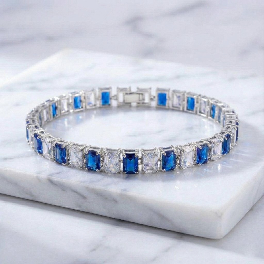 Elevate your wrist stack with a vibrant splash of color. This sophisticated bracelet features a rhythmic pattern of alternating Royal Blue and clear rectangular crystals. Expertly set in polished silver, the classic tennis design offers a luxurious, continuous sparkle that transitions seamlessly from day to night.