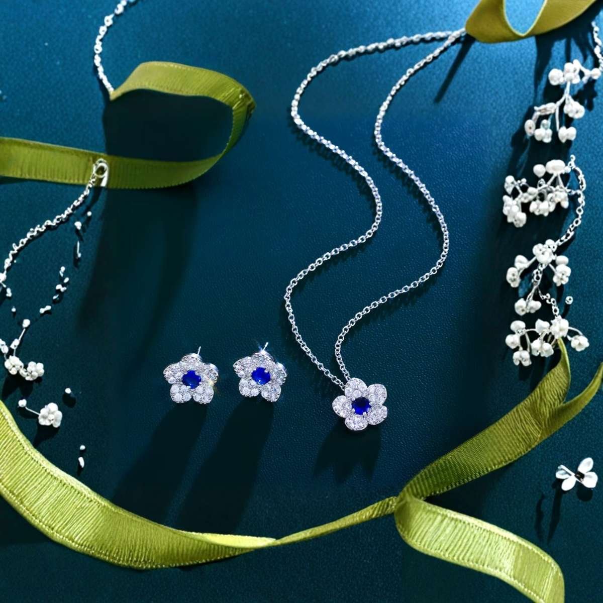 Capturing the beauty of a blooming flower, this exquisite set features a deep blue Cubic Zirconia center surrounded by sparkling clear crystal petals. Crafted from durable copper alloy with a lustrous silver plating, this necklace and earring trio offers a luxurious, high-shine finish.