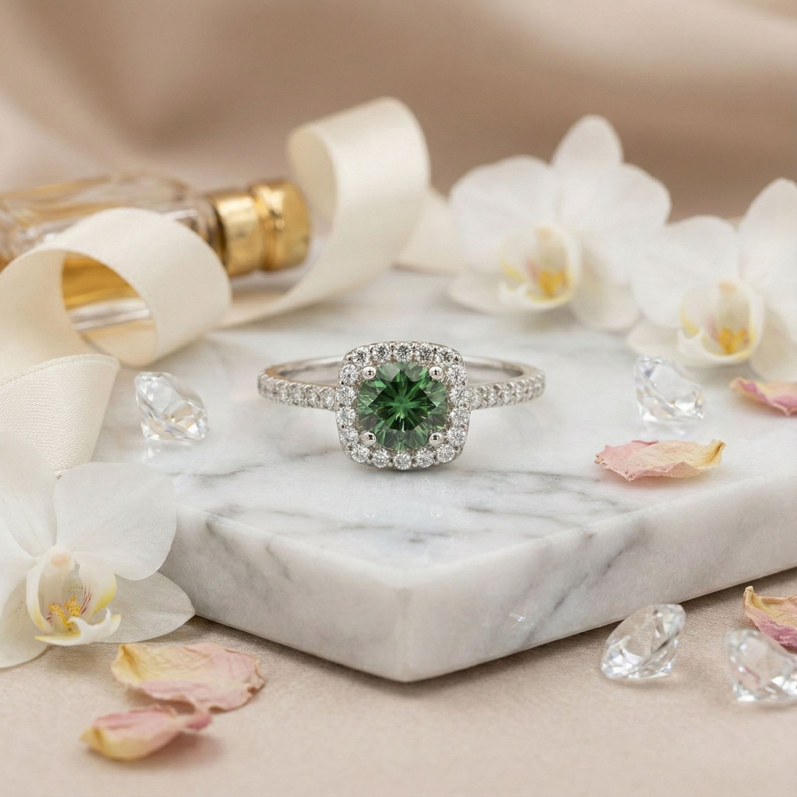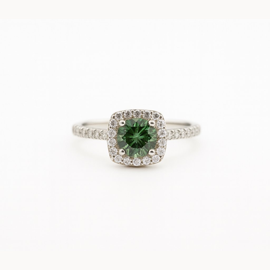 A vivid green moissanite glows at the heart of the Verda Halo Ring, framed by a sparkling halo of cubic zirconia for timeless brilliance.
