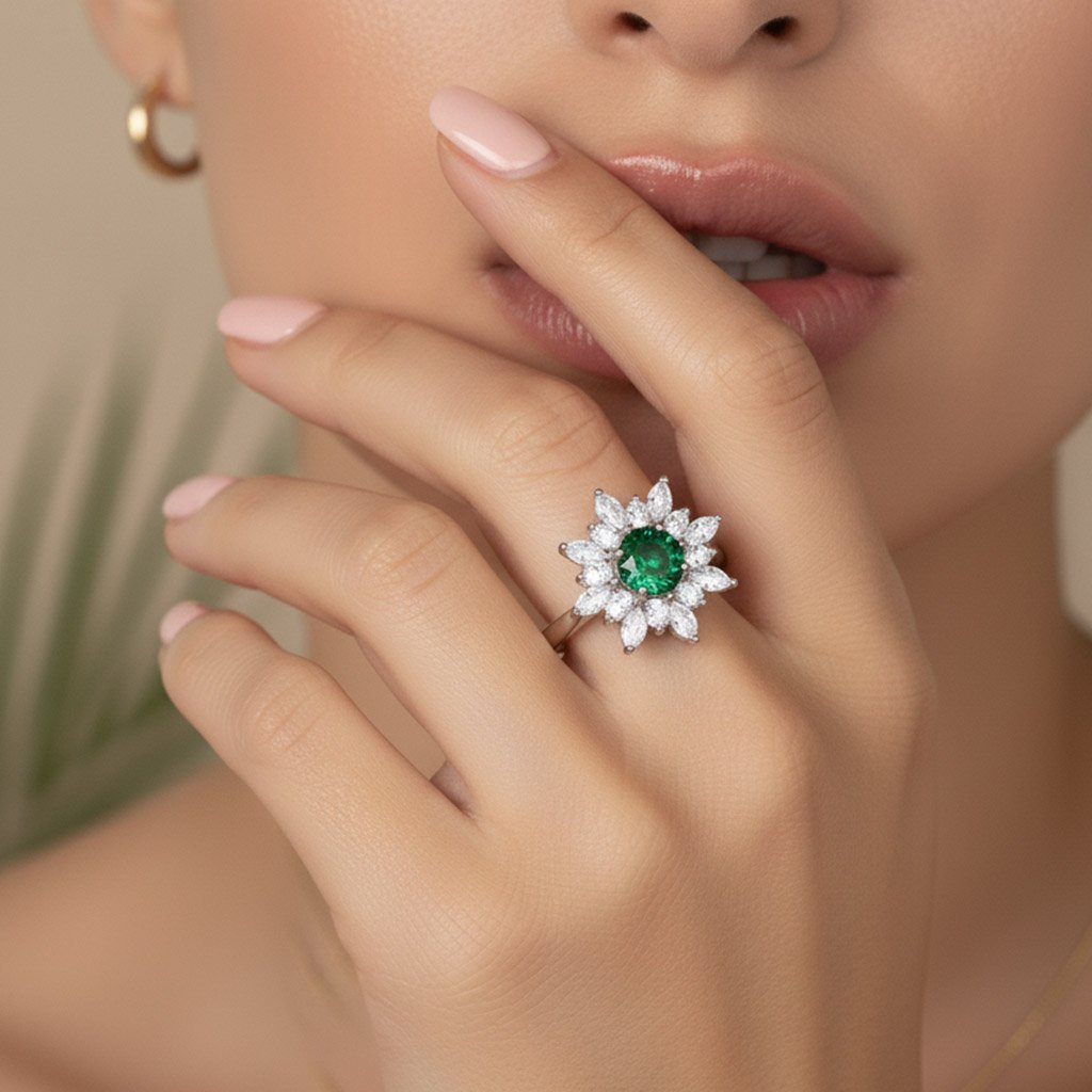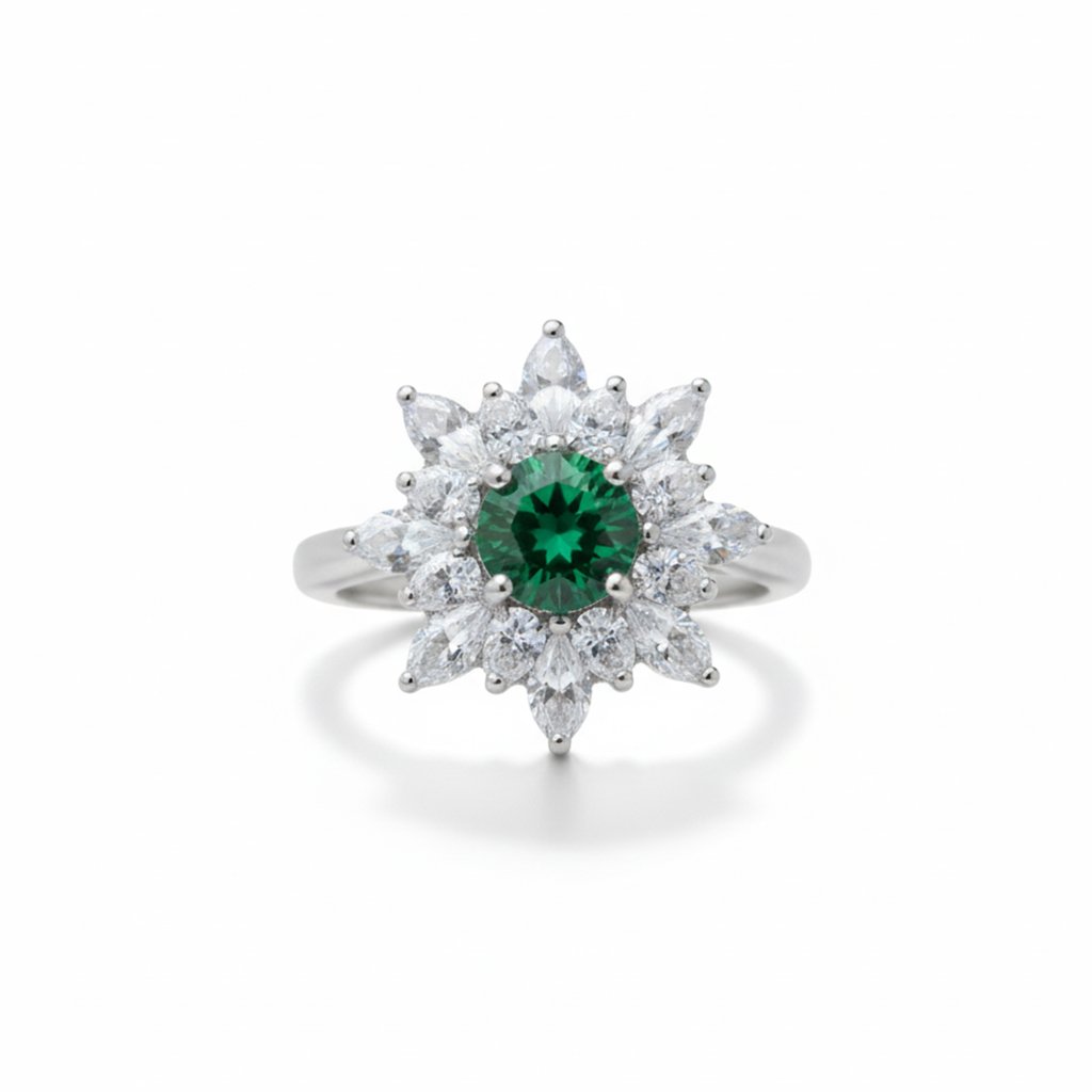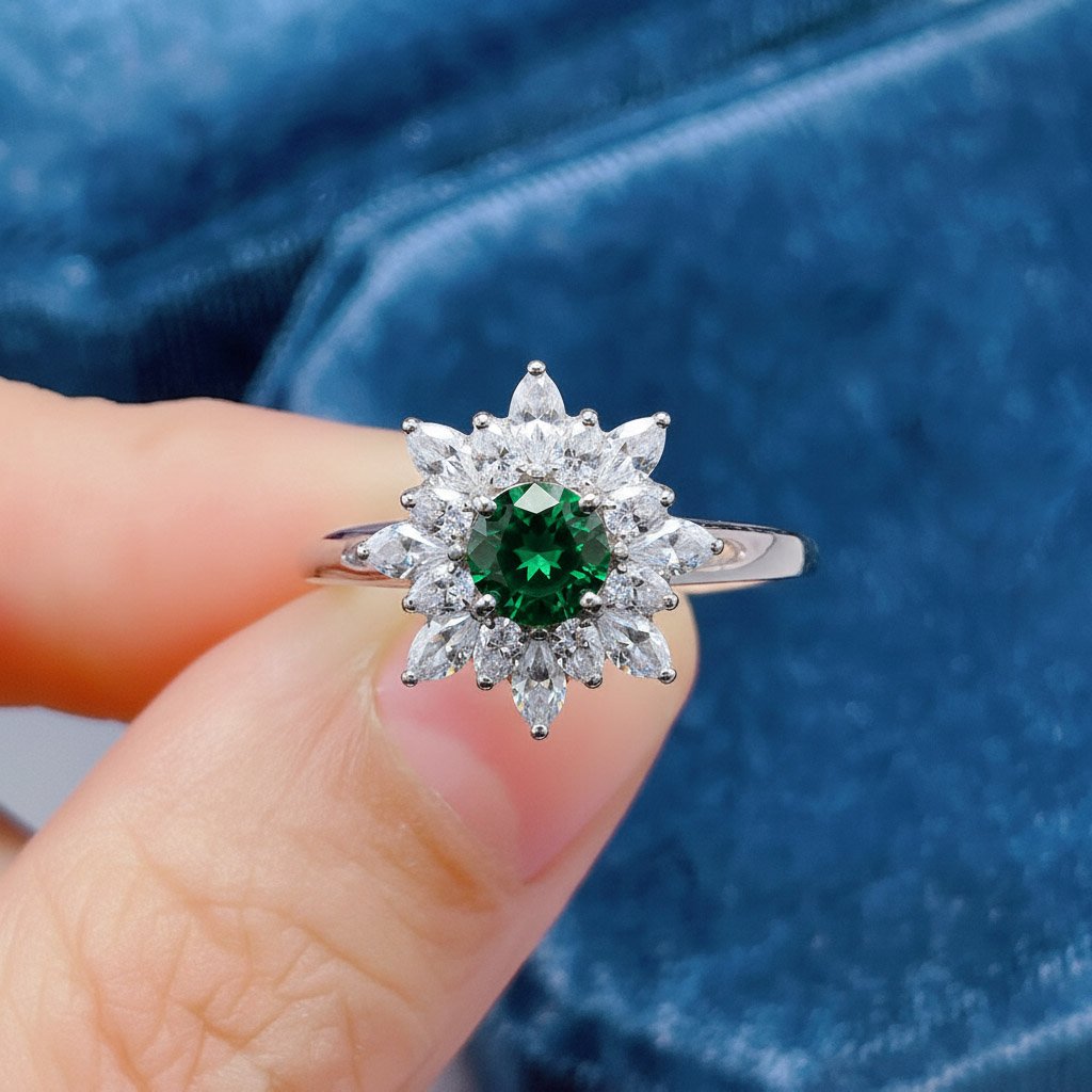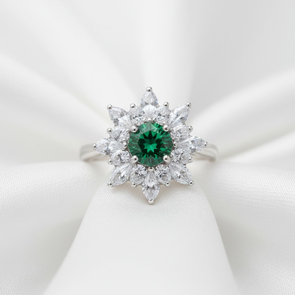 A luxurious silver ring centered with a brilliant, vivid Green Diopside surrounded by sparkling CZ petals.